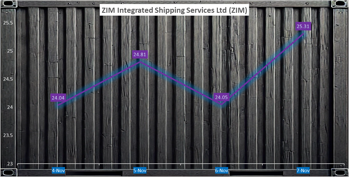 ZIM saw consistent upward momentum in the week, beginning at USD 24.04 on November 4 and ending at USD 25.31 on November 7. This steady growth indicates positive market sentiment or potential favorable developments in the company’s operations or broader economic factors, potentially a strong demand outlook for ZIM’s routes or services.