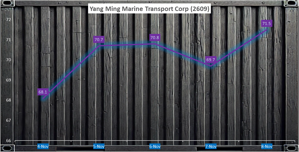 The stock for Yang Ming Marine Transport displayed an upward trend overall. Starting at TWD 68.1 on November 4, it reached TWD 71.5 by November 8, showing consistent gains with minor fluctuations. This upward trend could signal investor confidence in Yang Ming’s growth potential, perhaps due to expected demand or recent performance metrics.
