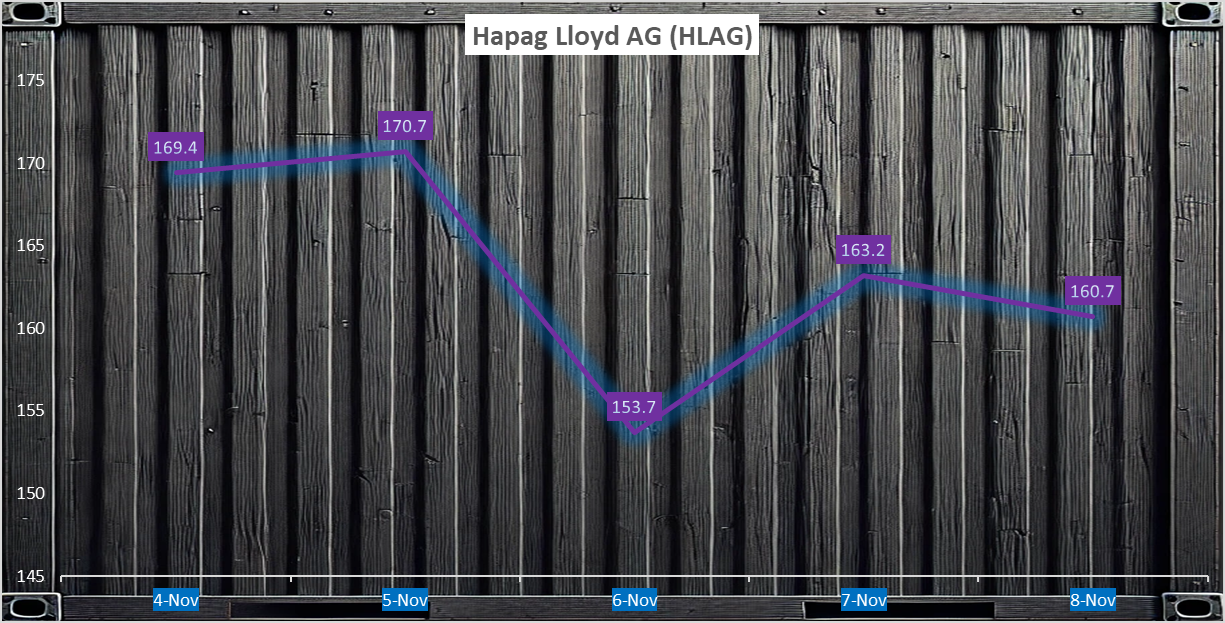 Hapag Lloyd had notable volatility. Beginning at EUR 169.4 on November 4, it rose to EUR 170.7 on November 5, then sharply fell to EUR 153.7 on November 6, and stabilized somewhat to close at EUR 160.7 by November 8. This pattern indicates significant market swings, possibly due to news affecting European shipping markets or Hapag’s operational performance.