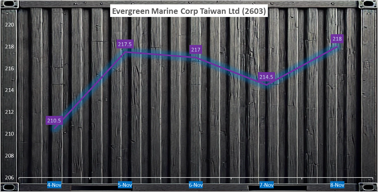 Evergreen Marine had a relatively stable and upward trend over the past week, moving from TWD 210.5 on November 4 to TWD 218.0 by November 8. This indicates a positive investor outlook, with consistent gains reflecting stability and likely confidence in Evergreen’s market position or operational performance.
