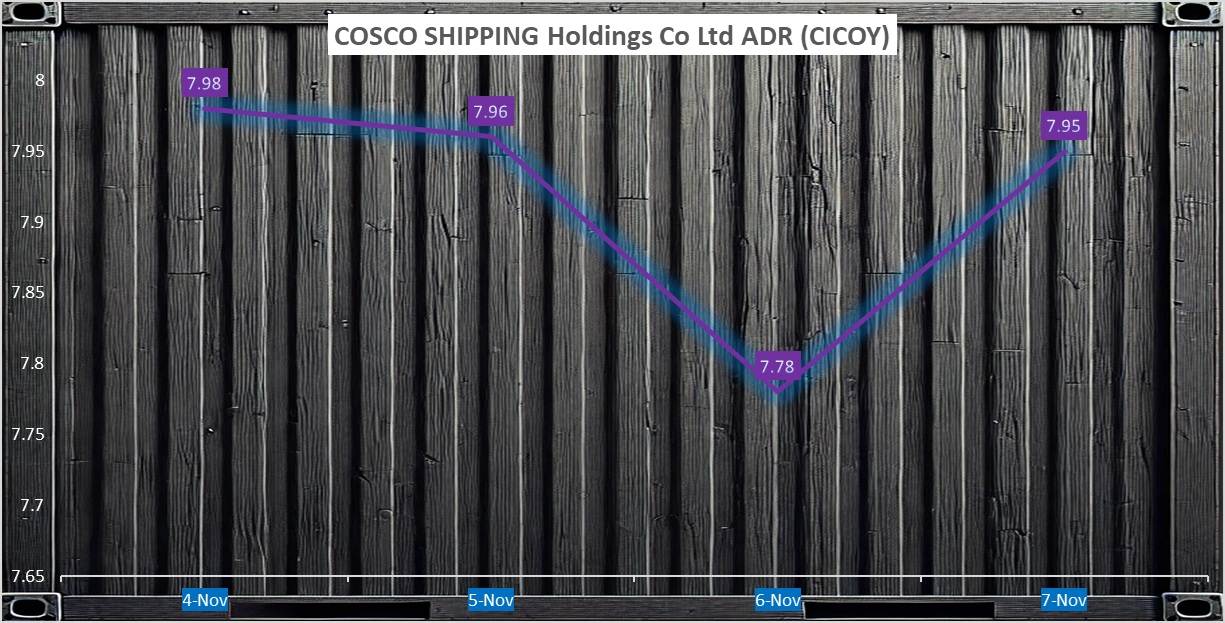 COSCO’s stock showed slight fluctuations throughout the week, starting at USD 7.98 on November 4. The price dipped to USD 7.78 on November 6, indicating some market uncertainty or negative sentiment surrounding the company, possibly driven by broader market trends or shipping sector-specific challenges. However, by November 7, the stock rebounded slightly to USD 7.95, suggesting a recovery in investor confidence or positive news impacting the company. These modest fluctuations could reflect market reactions to the evolving global shipping landscape, with investors adjusting their positions based on shifting demand expectations or operational updates from COSCO.