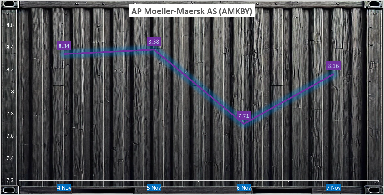 Maersk’s stock showed some volatility over the past week. Starting at USD 8.34 on November 4, it experienced a slight increase to USD 8.38 on November 5. However, the price dropped sharply to USD 7.71 on November 6, before partially recovering to USD 8.16 on November 7. This fluctuation may reflect market reactions to economic pressures on global trade or adjustments based on recent financial performance, with the partial rebound suggesting some regained confidence among investors.