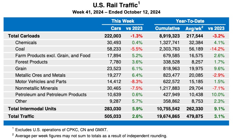 Through 41 weeks, carload volume is down 3.2% compared to the same period in 2023, while intermodal traffic is up 9.1%. The combined traffic represents a 3.1% increase from the first 41 weeks of 2023.