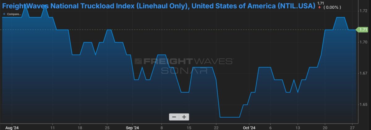 Outside factors have helped move freight rates higher, Leathers said. (The NTIL.USA freight rate in SONAR, representing the national average for linehaul only and no fuel charge, was $1.71 per mile Monday after being $1.64 per mile on Sept. 28.)