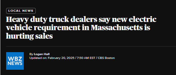 In Massachusetts, where the prospect of owning an EV semi is far less attractive than in sunny SoCal, heavy-duty truck dealers say EV requirements are hurting business.