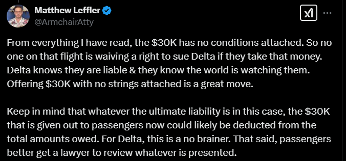 Miraculously, nobody died in that plane crash, but the Atlanta-based mega airline is already getting ahead of legal action. According to Fox Business, “Delta Air Lines confirmed the plans to provide $30,000 to each victim – 76 passengers and 4 crew members.” A Delta spokesperson has said that the offer “has no strings attached and does not affect rights.”