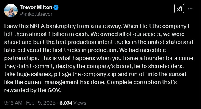 Speaking of Trevor Milton, the embittered founder and convicted felon has returned to the same place he got in trouble for saying too much in the past: social media.